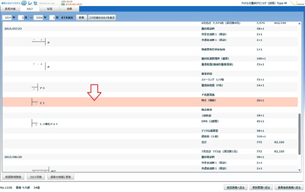 A.処置入力画面左上の処置日を改訂前の日付とした上で、冠等の点数を算定して頂き(右下画面に旧点数を下ろしていただき)ましてから、改めて左上の処置日を請求月の日付として保存をしてください。
